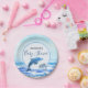 Babyparty-Ausrüstungsbeschreibungen des süßen Ozeans malten themenorientierte ein Aquarell Hintergrund der blauen Ozeanwellen und des blauen Himmels. In der Mitte ist ein weißer Kreis mit blauer Ordnung. Innerhalb des Kreises ist ein Mutterdelphin und ihr Delphinbaby. Über Mutter ist der Delphin und der Babydelphin Text im grauen Standard- und blauen Skript-Schriftart, in dem Sie den Mama-zusein Namen addieren können, um die Platte für ihre Babydusche zu personifizieren. Koordinaten tadellos mit unseren Mutter-und Baby-Delphin-Ozean-Thema-Babypartyeinladungen und -servietten!