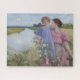 Dieses Design zeigt ein Gemälde der irischen Künstlerin Mildred Anne Butler (1858-1941). Es zeigt eine junge Frau mit einem rosa Kleid mit ihrer Tochter, die ein blaues Kleid trägt. Das Mädchen geht mit ihren bloßen Füßen an einer Ziegelwand entlang, während ihre Mutter an ihr festhält und sie unterstützt. Vor dem Mädchen wachsen einige wunderschöne wilde Rose; die Blume sind in verschiedenen Rosa- und Weißtönen gehalten. Andere Wildblumen wachsen auf der Wiese hinter Mutter und Tochter. Es gibt einen breiten Fluss, der durch die Wiese zieht, und in der Ferne gibt es einige Hügel und Bäume. Die ganze Szene spiegelt die Schönheit der Natur Irlands wider. Der Himmel ist klar, und nur ein paar weiße Wolken schwebten darüber. Das Originalwerk wurde 1919 von Mildred Anne Butler gemalt.