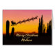 Eine Weihnachtskarte für Ihre Mütter, die den Weihnachtsmann über der Wüste zeigt. In der Silhouette sind viele große Kakteen zu sehen. Wünschen Sie ein frohes Weihnachtsfest aus der Wüste mit einer schönen Sonnenuntergang farbenen Karte.