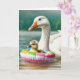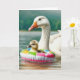 Eine ruhige Szene mit einer weißen Gans, die durch das Wasser gleitet, inmitten eines flauschigen Gosling in einem farbenfrohen, aufblasbaren Ring. Alle Texte können geändert werden.