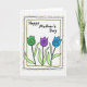 Entworfen mit einem süßen, handgezeichneten Look, zentriert sich diese Karte auf die Worte „Happy Mother's Day“, die nahe dem oberen Rand in einfacher schwarzer Schrift platziert sind. Direkt darunter stehen drei stilisierte Blüten zusammen wie enge Freunde, deren abgerundete Blütenblätter sanft zueinander geneigt sind und ein zartes, fürsorgliches Gefühl vermitteln ❤️. Jede Blume sitzt auf einem dünnen grünen Stiel mit kleinen blattartigen Formen und schafft eine leichte Gartenszene. Die drei Blüten sind grün, violett und himmelblau gefärbt und jede enthält ein enges Spiralmuster, das den Blütenblättern Textur verleiht. Die Hauptillustration befindet sich innerhalb eines weichen gelben Rechtecks, das von einer welligen schwarzen Umrandung umgeben ist und ihr ein gemütliches, von Hand gezeichnetes Aussehen verleiht. Um diese herum ist ein breiterer Rahmen mit unregelm