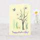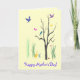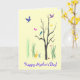 Diese Muttertagskarte erzeugt eine farbenfrohe, skurrile Frühlingsstimmung. Vögel fliegen und stehen im Baum. Schmetterlinge schweben in der warmen Luft. Eine Ente wadelt im Gras. Es gibt sogar eine winzige Schnecke auf dem Boden. Das Bild wird innen wiederholt. Alle Texte können auf Ihre Bedürfnisse angepasst werden.