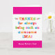 Sie nennen Ihre Mutter Ima, nicht Mama. (Ima bedeutet auf Hebräisch Mutter.) Stellen Sie sich vor, wie aufgeregt Ima sein wird, eine Muttertagskarte zu erhalten, die speziell an sie adressiert ist! Ihr Ima wird auch die Liebe dieses lustigen, farbenfrohen, textbasierten Design, das sagt "Danke, dass immer so ein phantastischer Ima! Alles Gute zum Muttertag!" Machen Sie diese Karte anpassbar! Klicken Sie auf "Design bearbeiten", "Unten/Rechts: Text & Bilder", "Text" und "Text hinzufügen", um Ihre eigene, personalisierte Nachricht an Ima inside zu schreiben!