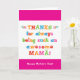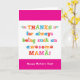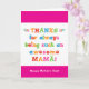 Sie nennen Ihre Mutter Mamă, nicht Mama. (Mamă bedeutet Mutter auf Rumänisch.) Stellen Sie sich vor, wie aufgeregt Mamă sein wird, eine Muttertagskarte zu erhalten, die speziell an sie adressiert ist! Ihr mamă wird auch Liebe dieser Karte lustige, farbenfrohe Text-basierte Design, dass "Danke für immer ein so phantastisch Mamă! Alles Gute zum Muttertag!" Machen Sie diese Karte anpassbar! Klicken Sie auf "Design bearbeiten", "Unten/Rechts: Text & Bilder", "Text" und "Text hinzufügen", um eine eigene, personalisierte Nachricht an Mamă inside zu schreiben!