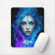 Add a supernatural touch to your workspace with this mousepad, which features an otherworldly female with ice blue eyes and delicate floral tattoos on her face, artistically emerging from blue and purple flames. Personalize with a name!
