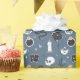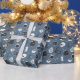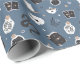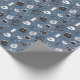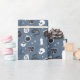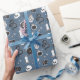 Das chic-glänzende Packpapier zeigt Schlangen, mystische Kristalle, Tränke, Zauberbücher, Kerzen, Gläser, Schädel, Tarot und Tränke auf einem staubigen blauen Hintergrund.