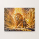 A glowing, majestic lion stands in a fiery, magical landscape. Beside it, a robed figure holds a radiant circular artifact, creating an atmosphere of power, mystery, and spiritual symbolism. A dramatic fantasy interpretation of the Leo zodiac sign.