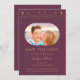 Mystical Plum Gold Sun Moon Stars Space Save The Dates verfügt über eine goldene Sonne, Mond und Sterne Rahmen auf einem Pflaumenhintergrund. Inside ist Ihr Lieblings-Foto und Ihre persönlichen Save the Date Informationen. Personalisieren Sie den Text in den Textfeldern, indem Sie ihn bearbeiten. Entwickelt für Sie von ©Evco Studio www.zazzle.com/store/evcostudio