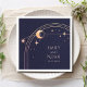 Mystische Celestial Rainbow Sun Star Moon Astronomie Space Wedding Napkins zeigt Sonne, Mond und Sterne mit einem goldenen Rahmen auf einem dunkelmarineblau blauen Hintergrund. Personalisieren Sie mit Ihren Namen und Datum oder benutzerdefinierten Text in der Mitte. Entworfen für Sie durch © Evco Studio. Teil einer Sammlung unter www.zazzle.com/store/evcostudio