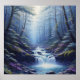 This whimsical poster features a serene forest scene with a gentle waterfall cascading over rocks, surrounded by lush greenery and hints of purple flora. Sunlight filters through the tall trees, creating a peaceful, mystical atmosphere. Finished as an oil paint art print.