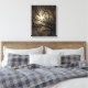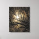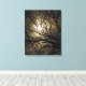 Dieser ummantelte Leinenprint weist einen mystischen Nachthimmel auf. Die Luft ist von Nebel durchdrungen. Der Vollmond, der durch die Bäume strahlt, erhellt die scheußlichen Wolken in Goldtönen, Gelb-Orange, Weiß und Braun und bildet ein interessantes abstraktes Muster.