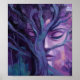 Dieses surrealistische Poster zeigt ein lila Ölgemälde des Gesichts einer ruhigen Frau, das mit knorrigen Baumzweigen verschlungen ist - ein träumerisches, texturiertes Porträt, das mystische, naturinspirierte Kunst hervorruft. Fertiggestellt in einem malerischen Öl-Acryl-Stil.