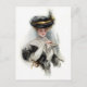 Elegante junge Dame in ihrer modischen Kleidung und Hut. Sie hält eine Tasse Tee.