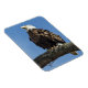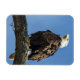 Ein Glatzenadler auf einem Baum-Ast, der nach oben blickt, als wäre er in Gedanken. Das Bild wird durch den hellblauen Himmel verstärkt.