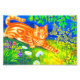 Foto Print mit Louis Wains Tiermalerei Cat Stalking (1860-1939). Eine orange gestreifte Katze geht nachts auf einem grünen Feld spazieren. Weiße, lila und rote Blume stehen im Vordergrund. Ein wunderbares Geschenk für Katzenliebhaber und englische Kunst.