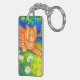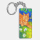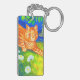 Schlüsselanhänger mit Louis Wains Tiermalerei Cat Stalking (1860-1939). Eine orange gestreifte Katze geht nachts auf einem grünen Feld spazieren. Weiße, lila und rote Blume stehen im Vordergrund. Ein wunderbares Geschenk für Katzenliebhaber und englische Kunst.