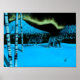 Zwei Wölfe jagen an einem kalten Winterabend. Das helle Mondlicht reflektiert den Schnee und die Birke; die Nordlichter leuchten darüber.