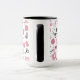 Eine Tasse, die einen nähenden themed Entwurf besteht einer Nähmaschine, Spulen des Fadens, einem Buttonkissen, Scheren, Gewebemustern und aus nähenden Nadeln kennzeichnet. Entwurf hat ein rosa Farbschema.