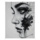 Ein links nahes Auftragen von Augen und Wangenknochen, das durch blutfarbige Farbtupfer und spontanes Pinselstrich mit schwerer Abstraktion überzogen wird. Nur ein Teil ihres Gesichts ist sichtbar, verblasst allmählich in Weiß und schafft eine auffallende und rätselhafte Komposition, die durch kühn ausdrucksstarke Striche Stimmung und Rätsel betont.
