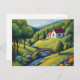 A gentle, dreamlike landscape stretches before you, painted in soft flowing hues of green, blue, orange, and purple. Trees with delicate leaves sway along the edges, their colors blending seamlessly into the surrounding bushes and rolling land. In the distance, a charming house nestles quietly among the trees.