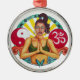 Originelle Kunst von Sandra Gale auf einem runden Ornament mit einem inspirierenden Design mit dem Zeichen für ohm, yin-yang, und andere mit einer schönen Frau meditieren. Ein einzigartiges und farbenfrohes Design der Spiritualität, das perfekt für jeden ist.