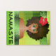 Eine attraktive Frau mit einem Afro auf einem grünen Hintergrund-Sprichwort Namaste, welches die Bedeutung des Namaste Grußes "der Gott-/Göttin-Geist innerhalb ich ist, erkennt und ehrt den Gott-/Göttin-Geist innerhalb Sie." Ein schönes Gefühl - wir sind eins