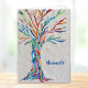 Diese Grußkarte enthält einen Ausdruck meines Mosaiks "Tree of Life". Das Original wurde aus vielen kleinen Teilen aus Set in lebhaften Farben hergestellt und in einen hellgrauen Haufen verwandelt. Ich habe das Wort Namaste hinzugefügt, aber Sie können dieses in ein anderes Wort oder einen anderen Namen ändern, um diese Karte anzupassen. Original Mosaic © Michele Davies