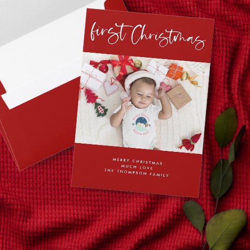Baby First Christmas Foto Name Adresse Rot. Feiern Sie Ihre ganz besondere Zeit als neue Eltern für Ihre Ferien-Mailings mit Ihrem Namen und Ihrer Rücksendeadresse, die Sie einfach personalisieren können und Ihr LieblingsFoto mit rotem Hintergrund. Die künstlerische Set-Typografie ist der Kopf oben.