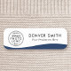 Weiße Namensmarke mit dunkelblauer Wellenlinie am unteren Rand und individuelle Name und Titel. Laden Sie Ihr eigenes Logo hoch und erstellen Sie Namensmarken für Ihr Unternehmen oder Ihre Veranstaltung. Mit dem Designwerkzeug können Sie Schriftart und Farben ändern.