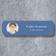 Eine Minimalistische Namensmarke mit einem Kreis-Foto-Rahmen für Mitarbeiter- oder Kleinunternehmen mit Namen und Job oder Service, alle auf blauem Hintergrund. Sie können auch Ihr eigenes Logo anstelle des Fotos hinzufügen!