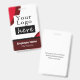 Abzeichen für Firmenname oder Firmenangestellte mit rotem und weinfarbenem gestreiftem Hintergrund. Der gesamte Text ist einstellbar. Fügen Sie Ihr eigenes Firmenlogo hinzu. Made für lange horizontale Logos. Wenn die schnelle Vorlagenanpassung für Ihr Logo nicht funktioniert, klicken Sie auf die weitere Option anpassen, um Ihr Logo zu löschen und auf die Karte hinzuzufügen.