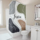 Personalisierter Duschvorhang mit modernen abstrakten geometrischen Formen in Grün, Grau, Blau und Braun und personalisiertem Namensdruck in der Mitte.