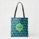 © 2016 Sozialite Designs. Schöne moderne Pfauenfedermuster Design Tasche, Farben aquamarin, türkis, grün mit einem hellgrünen Banner für Ihren Namen. Eine elegante Tasche, die Sie jeden Tag benutzen können. Personalisieren Sie diese Tasche mit einem Namen oder Monogramm.