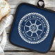 Pothalter mit weißem, elegantem Schiffrad- und Seilemblem mit individuellem Bootsnamen und Hagelhafen (oder anderen benutzerdefinierten Texten) auf dunkelblauem Hintergrund.