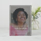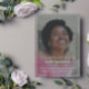 Gedenkgottesdienst zur Feier des Lebens mit schlichtem, weißem Text gegen ein Foto Ihrer Lieben. Das Foto wird durch einen transparenten grauen Filter gestummt, um den Text sichtbarer zu machen.