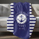 Fleecedecke mit einem nautischen Ankermotiv, blau-weiß gestreiftes Muster und personalisierter Familienname in der Mitte. Personalisieren Sie es mit Ihrem eigenen Familiennamen und Jahr, in dem Sie Ihre Familie gegründet haben. Die perfekte Wohngestaltung für ein Seehaus, eine Strandhütte oder um ein Gefühl an See und Strand zu Ihrer Zuhause zu bringen.