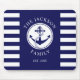 Nautical themed marineblau-blau-weiß gestreiftes Muster Mauspad mit einem nautischen Anker und personalisierten Familiennamen in der Mitte.