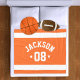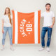 Personalisiertes Sportvlies für Athleten mit einem Vor- oder Nachnamen in kurvenreicher sportlicher Schrift und einer Teamnummer. Weite horizontale Streifen und Sterne unterstreichen dieses einfache und stilvolle Design. Das Farbschema von orange und weiß kann so geändert werden, dass es sich mit den Farben Ihres Clubs oder der Schule abstimmt.