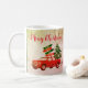 Eleganter klassischer, roter Weihnachtswagen mit Familiennamen und Weihnachtsbaum im Weihnachtsstil.