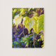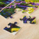 Sunlit Trauben-Blätter und zart kräuselntendrils machen ein auffallendes Bild gegen eine Hintergrundpalette von Blauem, von Lila, von rosa und von Grünem.