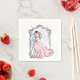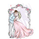 Illustration eines Ehepaares, das unter einem Blumenbogen küsst, der Mann ist weiß, 28 Jahre alt, mit braunem Haar, einem hellblauen Anzug und einer weißen Hose, die Frau ist weiß, 25 Jahre alt, blondes Haar, ein langes rosa Kleid mit Blumendetails, der Bogen ist mit rosa und weißen Rosen und grünen Blätter geschmückt kühne Konturen und sanfte Farben.