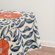 Seamless floral pattern with vibrant orange flowers and navy blue leaves on a beige background, creating an ornate, symmetrical design.