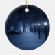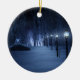 Ein schneebedeckter Weg, der sich in einer dunklen Winternacht durch den Birkenwald schlängelt. Der Weg ist von Laternenpfählen gesäumt, die ein silberblaues Glühen verleihen, aber im Schatten sind die Formen, wie kleine Lichter aus Märchen, hell und verleihen dem Reisenden den Weg. In der Ferne leuchtet der Lavendel einer geheimnisvollen Ansammlung des Waldes den kalten Himmel.