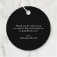 Moderne Gastgeschenk Hochzeit-Tags mit einem einfachen und minimalen Schwarz-Design mit Ihrem Monogramm in einem kühlen Schriftart zusammen mit Ihren Namen in einer eleganten Handschrift und Ihrem Hochzeitstag in einem Serif-Schriftart. Der Rücken hat Ihre personalisierte Danksagung.