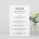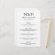 Menu mariage moderne avec un design simple et minimaliste noir et blanc avec votre monogramme en caractères gras avec vos noms dans un élégant script d'écriture manuscrite.