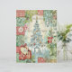 The design features a charming patchwork border of rich reds and varied greens with damask, plaid, and scenic patterns. The center showcases a stunning, icy blue Christmas tree, heavily decorated with gold and silver ornaments, set against a background of sheet music. Below the tree, a serene Nativity scene is subtly rendered in blue tones.