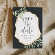 Eine schöne, grüne und goldene Hochzeit bewahrt die Dattelkarten mit grauer Schrift, die von einem geometrischen Imitat mit goldfarbenem Rand gerahmt ist, und hellgrünem Wasserfarbenfolien, Blätter und weißen Beeren auf einem kontrastierenden, weichen schwarzen Hintergrund. Personalisieren Sie Ihre Namen, Ihr Hochzeitstermin und Ihren Standort und fügen Sie zusätzliche Informationen, wie Ihre Hochzeitswebsite, auf der Rückseite ein. Eine moderne Wahl in einem natürlichen Farbschema für Hochzeiten im Boho-, Wald- oder Naturbereich zu jeder Jahreszeit.