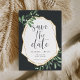 Eine schöne grüne und goldene Hochzeit bewahrt die Dattelkarten mit grauer Schrift, die von einem Imitat mit geometrischer goldener Grenze gerahmt ist, und einem dunklen Jäger mit grünem Aquarellgrün, Blätter und weißen Beeren auf einem weichen schwarzen Hintergrund. Personalisieren Sie Ihre Namen, Ihr Hochzeitstermin und Ihren Standort und fügen Sie zusätzliche Informationen, wie Ihre Hochzeitswebsite, auf der Rückseite ein. Eine moderne Wahl in einem natürlichen Farbschema für Hochzeiten im Boho-, Wald- oder Naturbereich zu jeder Jahreszeit.