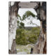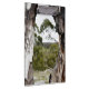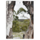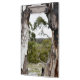 Dieses Bild, aufgenommen in Loddon in Victoria, Australien, zeigt eine nahe Aufnahme eines ausgehöhlten oder teilweise verbrannten Baumstamms, der eine üppige, grüne Landschaft im Hintergrund umrahmt. Die Rinde des Baumes besteht aus einer Mischung aus schwarzen, karierten Flächen und glattem, hellen Holz, möglicherweise aufgrund von Feuer- oder Naturschäden. Durch die Öffnung im Baum sind sanfte Hügel mit viel Grün und verstreuten Bäumen sichtbar. Der Gesamteffekt schafft einen natürlichen Rahmen, der die Komposition tiefer macht, mit dem Kontrast zwischen der rauen, strukturierten Rinde und der weichen, entfernten Landschaft.