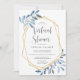Vous planifiez une douche virtuelle au lieu d'un événement en personne? Apportez des proches avec cette belle invitation à la douche nuptiale ou à la douche avec un thème feuillage boisé. Le design présente du lettrage gris encadré par une bordure géométrique en faux or et un feuillage bleu aquarelle glacé, des feuilles et des baies blanches. Choix moderne dans un jeu de couleurs naturel pour la mariée ou les baby showers à thème boho ou nature, vous pouvez utiliser les champs de texte modèle pour ajouter les détails de votre collecte virtuelle, y compris le lien de conversation vidéo ou de vidéoconférence, les informations de registre et l'adresse postale.
